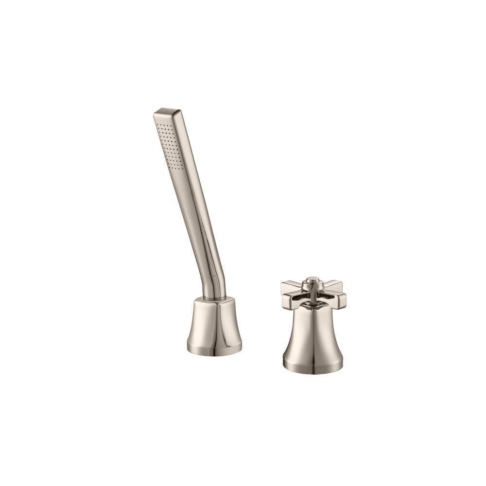 This deck diverter comes with a deck diverter valve installed under the tub deck [Flusso Part # DKM.2420], Handles, Handheld Shower Head, Holder and all associated hoses and mounting hardware.